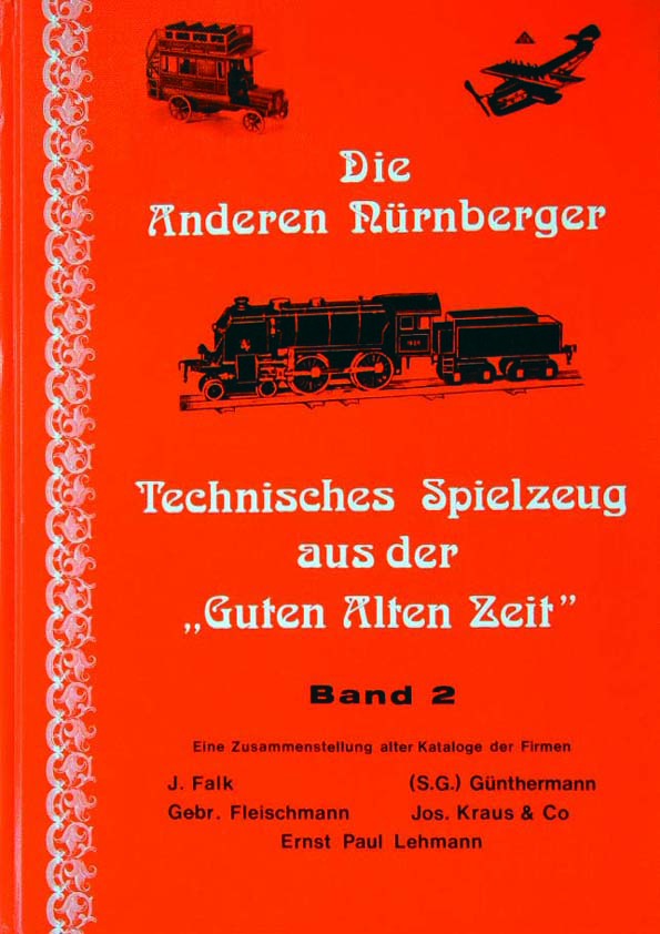 Die Anderen Nürnberger Band 2. Technisches Spielzeug aus der Guten Alten Zeit. Eine Zusammenstellung alter Kataloge der Firmen: J. Falk, (S.G.) Günthermann, Gebr. Fleischmann, Jos. Kraus & Co und Ernst Paul Lehmann. 460 Seiten, über 2500 Abbildungen.